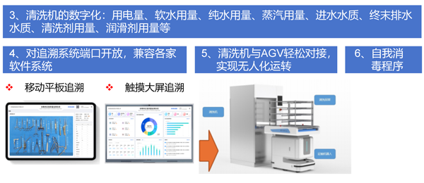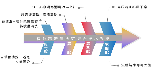 2、處理工藝:噴淋預(yù)清洗→加酶噴淋清洗(灌流+超聲波)→純水噴淋漂洗(灌流)洗→熱水消毒→凈熱循環(huán)干燥